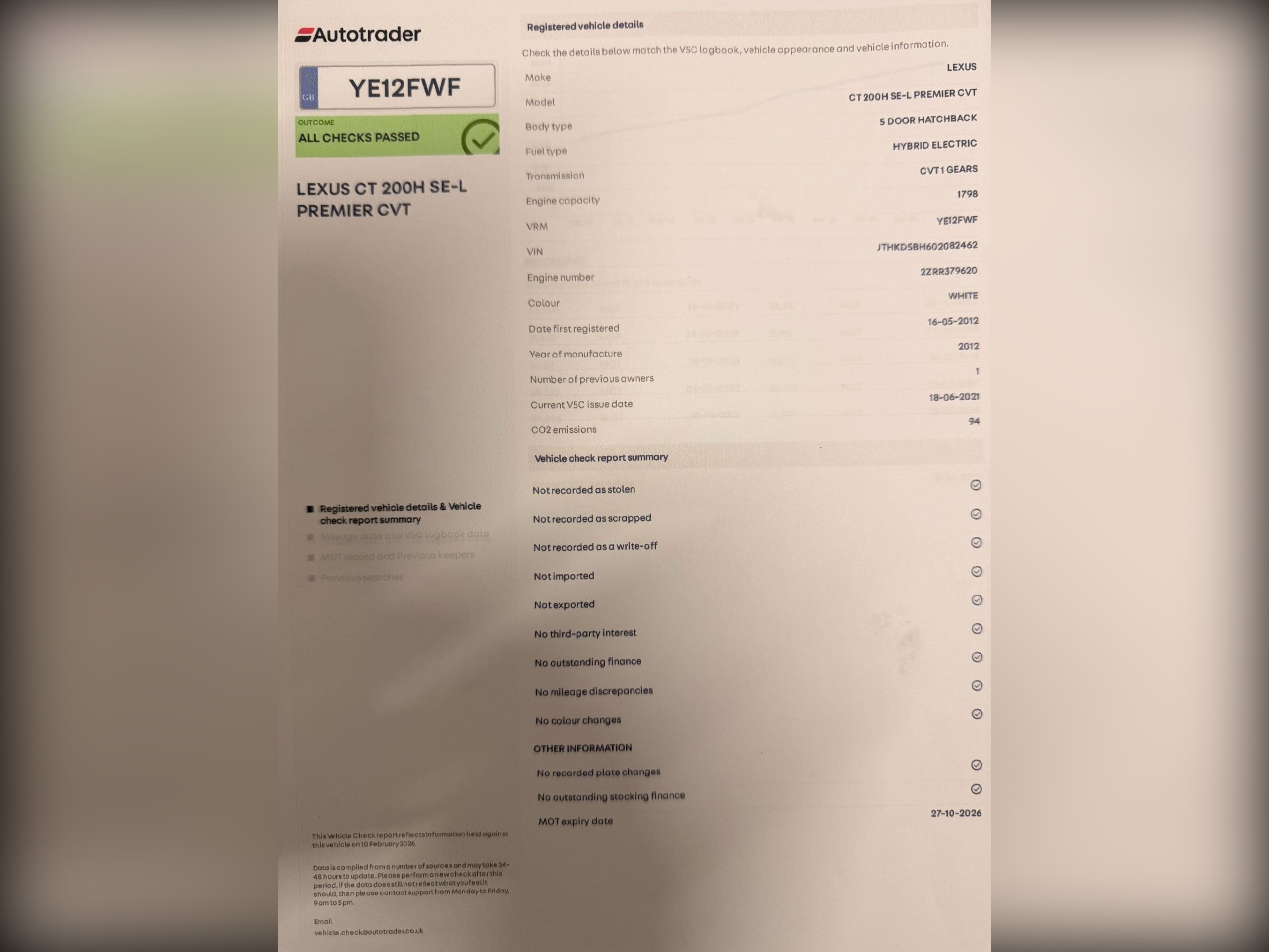 Engine Size:1.8LMPG Combined:68mpgMPG Urban:68mpgMPG Extra-urban:70mpgMOT Expires:27/10/2026 -